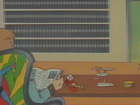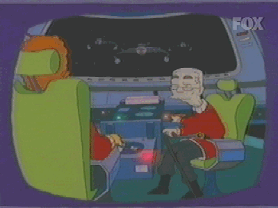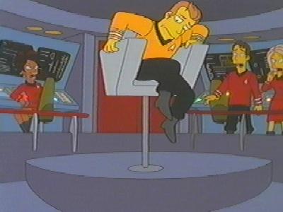 ザ・シンプソンズ第261話(第12シーズン)「バイ・バイ・プレイズランド」〜コミックショップのオーナーが見た幻想の世界では、彼はスポックになっており、暴れまわるイスから船長を救います。すると、ウフーラから「あなたと、いいことしたい」と誘いをかけられます。(下中と下右の画像)