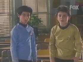 X−ファイル 「ドリームランド Part2」(第6シーズン)〜冒頭のモルダーの少年時代の説明のシーンで、少年のモルダーがTOSの制服(青)を着て、トンガリ耳を付けています。(下中の画像)