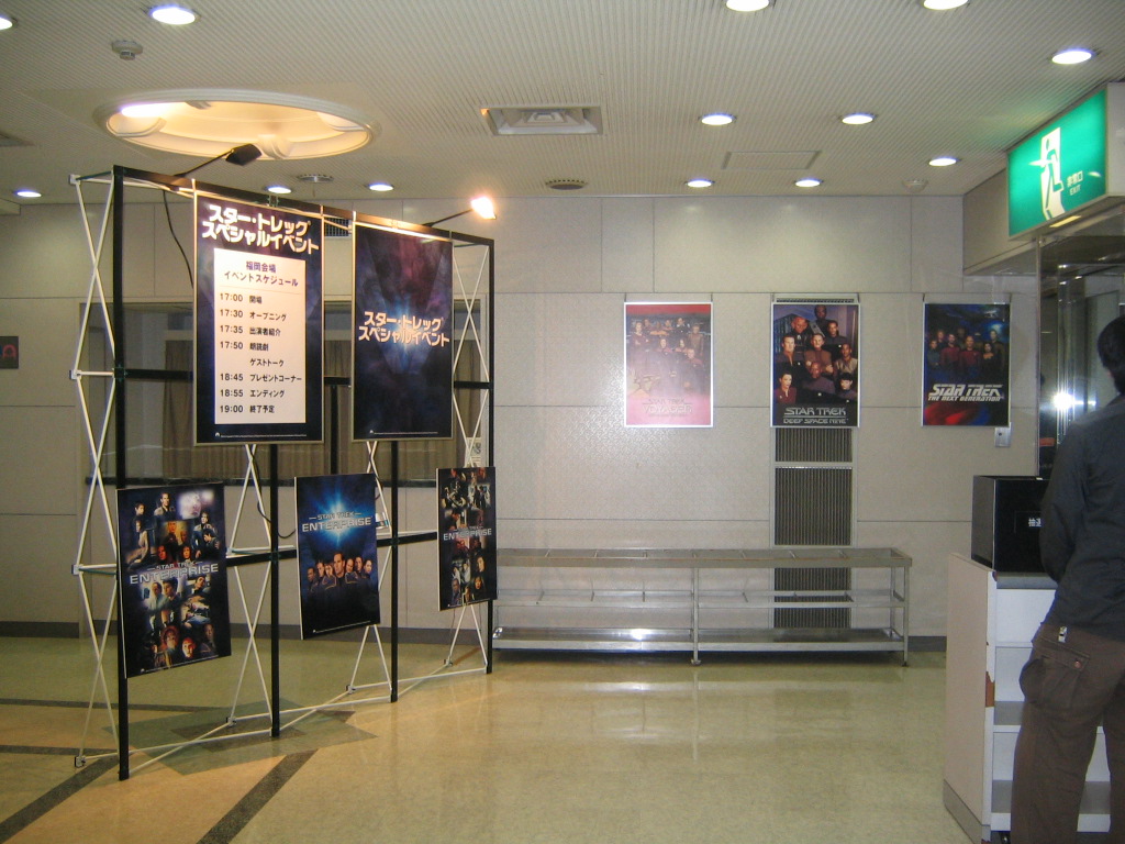 このイベントは、「スタートレック ヴォイジャー」DVD-BOXシーズン7と「スタートレック エンタープライズ」DVD-BOXシーズン1を購入し、同封されたハガキで応募した者の中から抽選により当選した者が参加対象となりました。2005年11月26日に福岡で、27日に京都で、12月4日に東京で開催することになっていましたが、私は福岡会場に参加させていただきました。今回のイベントには、谷口節さん(ENT:アーチャー船長役) ・内田直哉さん(ENT:タッカー役、DS9:ウェイユン役)・本田貴子さん(ENT:トゥポル役)・松岡洋子さん(VOY:ジェインウェイ艦長役)・青山穣さん(VOY:トゥボック役)・沢海陽子さん(VOY:セブン・オブ・ナイン役、TNG:ターシャ・ヤー役)・大塚明夫さん(TNG:ライカー役) 、星野充昭さん(TNG:ラフォージ役)・大川透さん(DS9:ガラック役)の9人の声優さんが、ゲストとして招かれました。