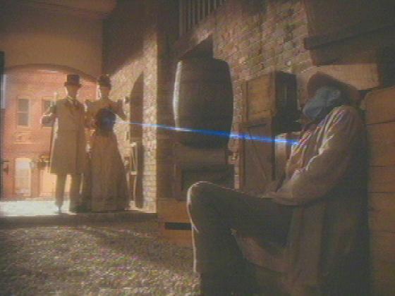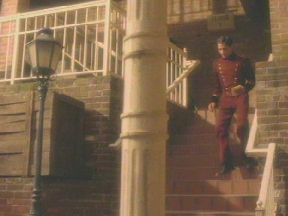 ここは、19世紀のサンフランシスコにデータが迷い込みホテルを見つけるシーンが撮影された所ですが、前回調べられなくて気になっていたシーンがあって、それが下の2枚の映像なんですが、ホテルのボーイが浮浪者の前を通り過ぎ、そこに現れたエイリアンの2人が浮浪者から生命エネルギーを吸収して、去っていきます。このシーンの撮影ポイントなんですが、おそらく通りの一番南の所だろうと思っていたのですが、調べると階段のようなものはなく、どうも違うようで、いったいどこなのだろうと探し回っていたら、どうやらピコ・ハウスと呼ばれる建物(下の下左の写真)の内部のようでした。写真中央やや下に濃い茶色の扉がありますが、その中を撮