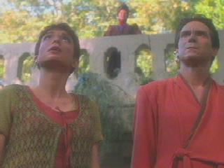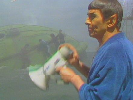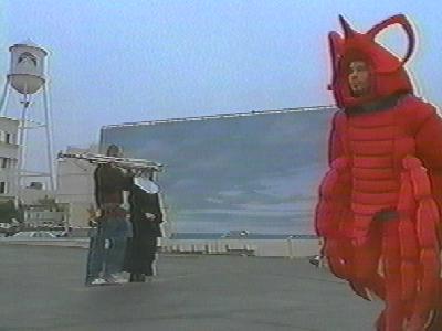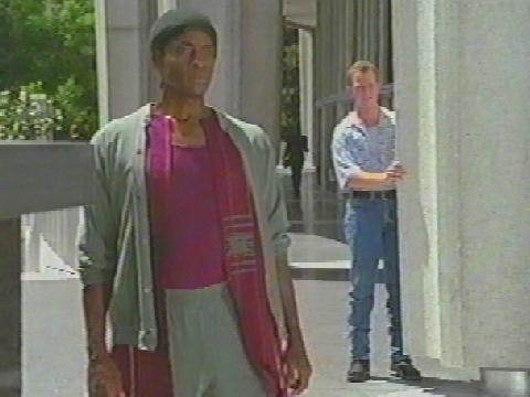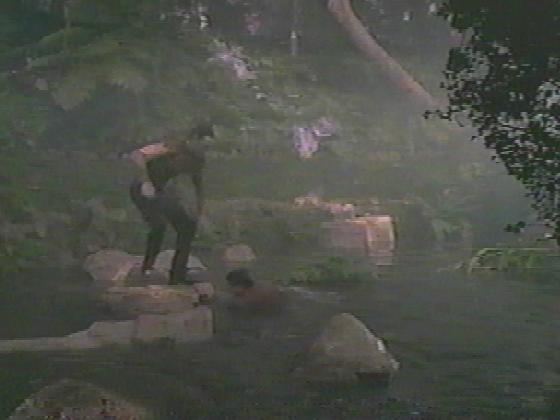 下の2枚の映像は、左が「ロズウェル 星の恋人たち」第47話「死因のなぞ」の給水塔とプールのスクリーンが写った1シーン、右が映画撮影時の様子(LD特典のメイキング番組より。手前はトンガリ耳のニモイ監督)です。