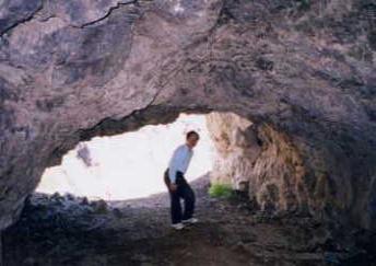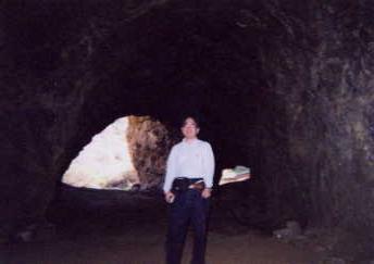 下左の画像はVOY第11話「裏切り者」の惑星でチャコティが洞窟に入ろうとしているシーンですが、これは上記の3つ穴の向かって右側の穴(上の見下ろして撮った写真の右端近くの穴〜手前の木の枝に少し隠れており、穴の手前にしゃがんだ人が小さく写っています)でした。ここでも、記念撮影しました(下右の写真)。 (^^)