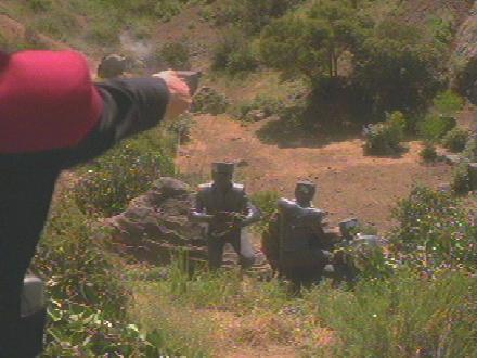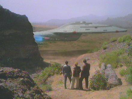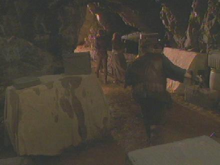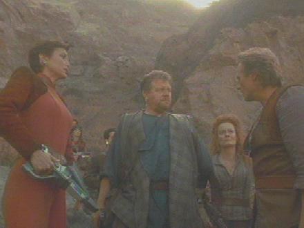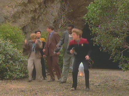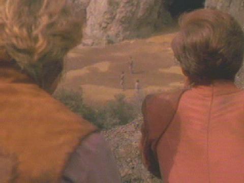 ところで、上記の洞窟の入口を谷の反対側少し上から見下ろしたのが、下左のDS9第70話「シャカールの乱」の画像(手前の後ろ姿は、キラとシャカール)で、同じ場所にVOY第20話「ミッシング1937」で灰色の服を着た人物が立っています(下中の画像/手前の右手はジェインウエイ)。