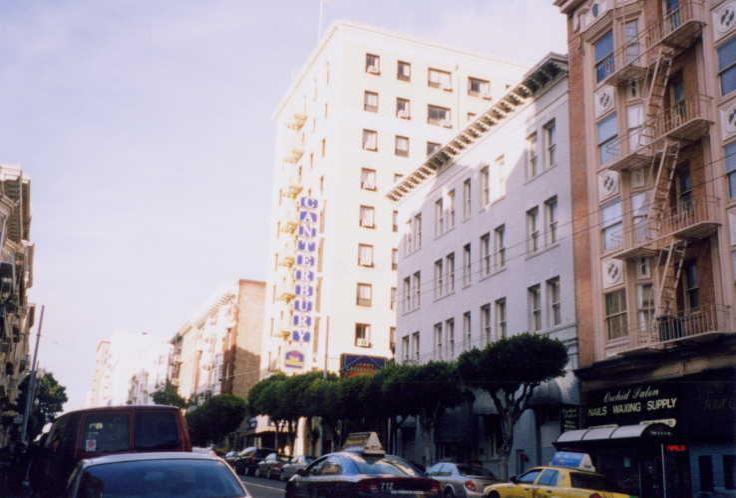 ホテル。どちらかと言うと、伝統的な感じのこじまりしたホテルで、グレードはあまり高くないのだが、安くて落ち着く感じだし、まあ、私にとっては部屋にTVがあってUPN系のチャンネルが映ればそれで十分なわけで・・・。(左の写真の中央の青い看板のある建物です。)