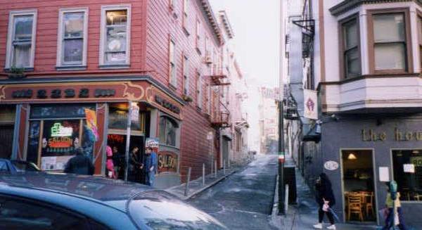 左の赤茶色の建物の1階はサンフランシスコでもかなり古くから営業しているバーだそうです。右のイエローページの広告だった所は、今は「The House」という店になっていました。
