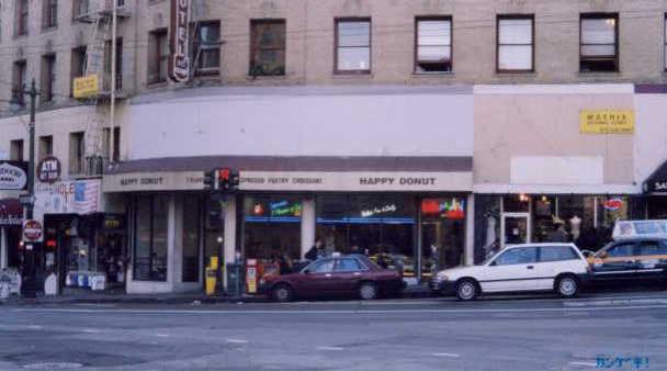 その角にある店が当時は黄色い看板のWinchell's Donutsという店でしたが、現在はHappy Donutsという店に変わっています(左の写真)。中には入りませんでしたが、その名の通りドーナッツや飲み物などを提供している喫茶店のような感じの店でした。