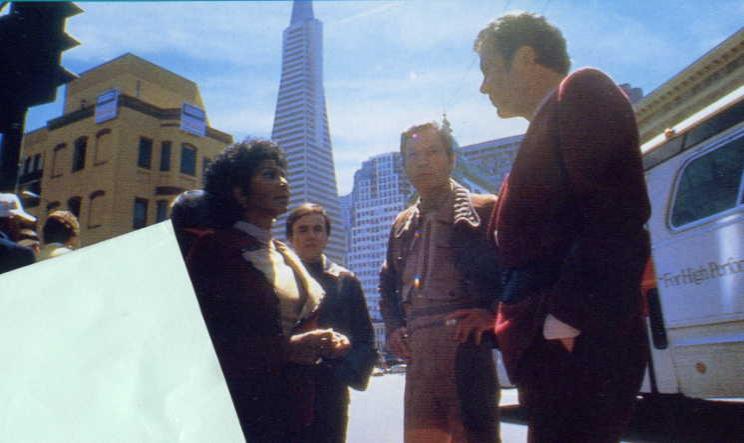 今回旅の記録を書くに当たって、「スター・トレック4/故郷への長い道」の映画パンフレットを見ていたら、左のような写真が載っていました。撮影時のメイキング写真でしょうが、この場所で撮影されたようで、後ろにトランスアメリカ・ピラミッドが写っています。