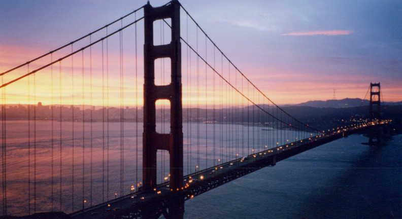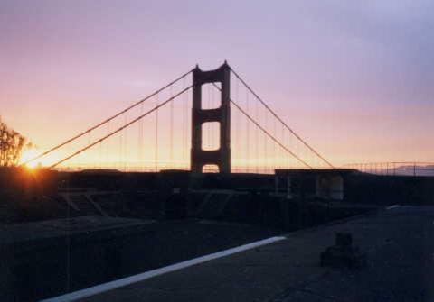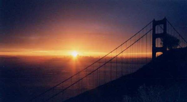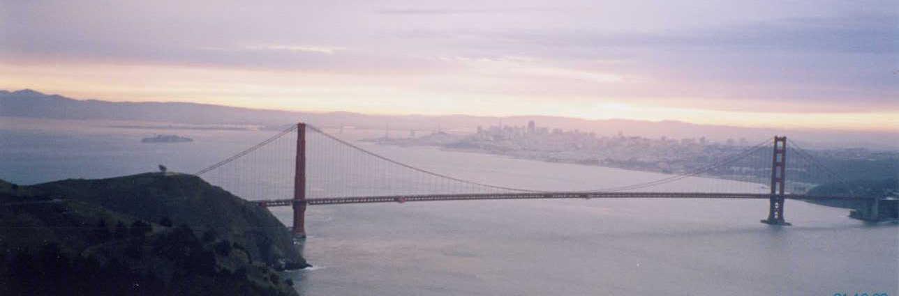 風が強く、冷たい。しかし、東の空が赤く染まり、橋とシスコの街が美しい。この光景を見ただけでもシスコに来た価値がある。