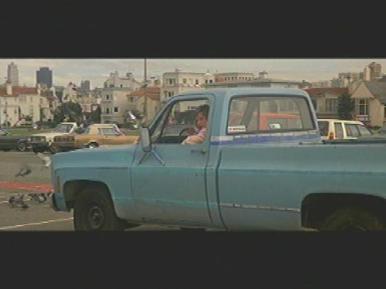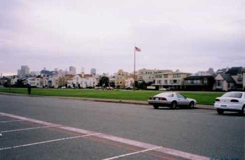 ところが、ここに来て気づいたんですが、ここって道じゃないんです。マリーナ通りと海岸の間にはちょっとした広場(というか、芝生が広がっていて)があって、カークとスポックがジリアンの車に乗り込む、まさにこの場所は道ではなく、駐車場でした。よく見るとカークとスポックの足元に駐車用の白線が引かれているのが分かります。