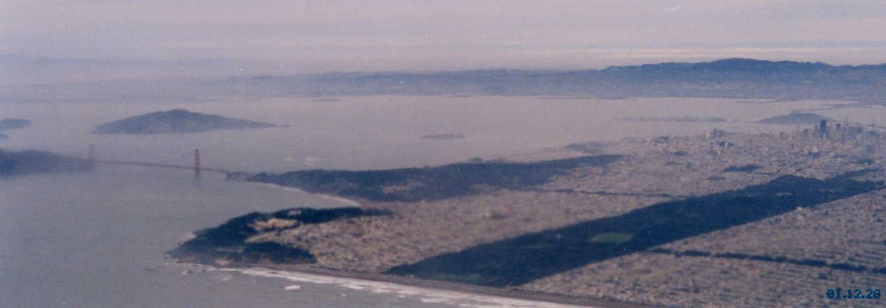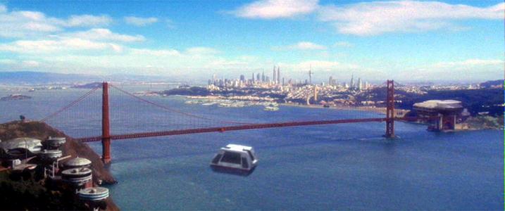 下の写真の左の方がゴールデン・ゲート・ブリッジ。右端がダウンタウン。右手前の長方形の緑がゴールデン・ゲート・パークです。カークたちが乗ったバード・オブ・プレイはあそこに下り立ったわけです。