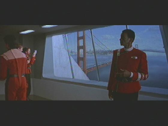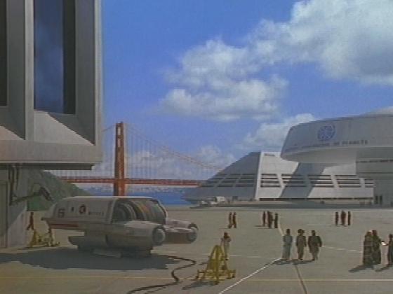 下左の画像は、TNG第25話「恐るべき陰謀」から。艦隊本部の向こうに橋が見えます。ST4でも同様のシーンが見られます。