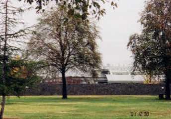 とはいえ、ここまで来て諦めきれるものでもなく、隣の公園にタクシーを止めてもらう。プラントと公園の間には高さ2メートル余の壁があり、その壁越しにプラントの建物の上部が見えている。(右の写真)